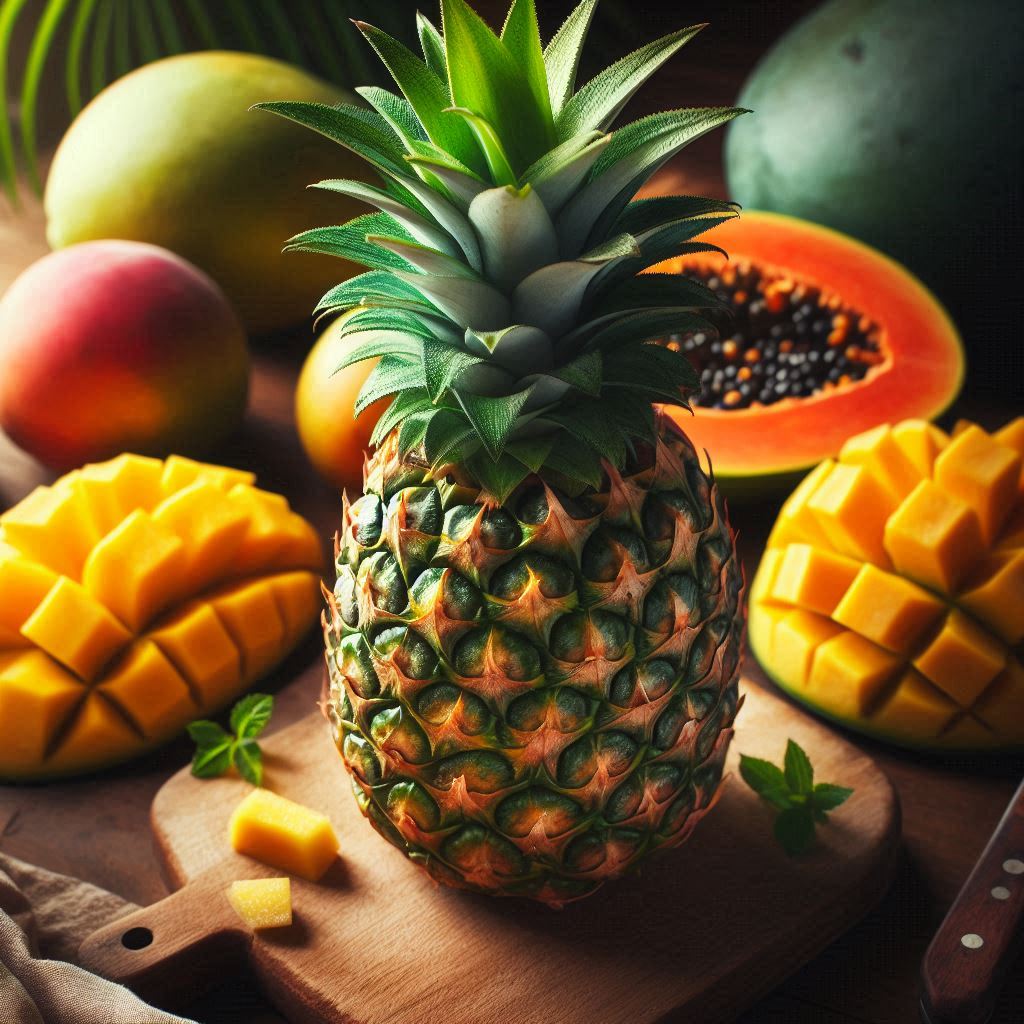 파인애플은 브로멜라인이라는 소화 효소가 풍부하여 소화를 촉진하고, 염증을 완화하는 데 도움을 주는 과일입니다.